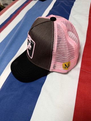 Gorra con diseño del personaje Buu de Dragon Ball Z. - Parche frontal con Buu y texto BUU. - Paneles laterales de malla rosa. - Visera y parte frontal en color gris. - Parte inferior de la visera en negro.
