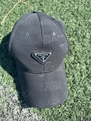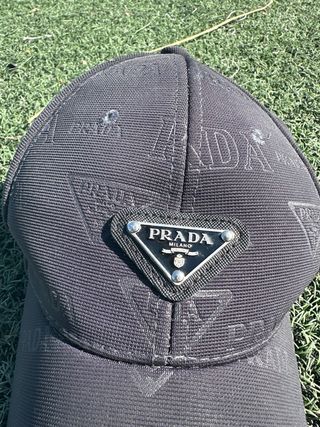Gorra de la marca Prada con un diseño llamativo y elegante. - Logo triangular de Prada Milano en la parte frontal. - Estampado repetido del logo de Prada en toda la gorra. - Color negro.