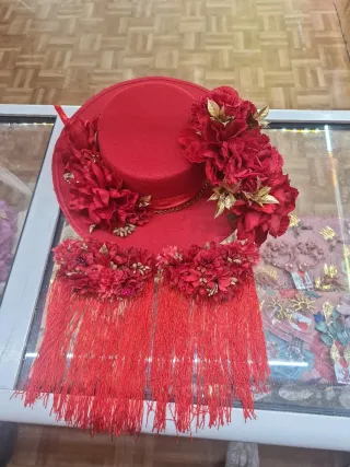 Elegante conjunto de sombrero adornado con flores y detalles dorados. Incluye un accesorio a juego con flecos largos. - Flores de tela rojas. - Adornos dorados. - Flecos rojos.