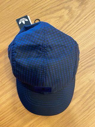 Gorra Adidas con un diseño moderno y llamativo. - Estampado de cuadros pequeños en azul sobre fondo negro. - Parche con el logo de Adidas en la parte frontal.