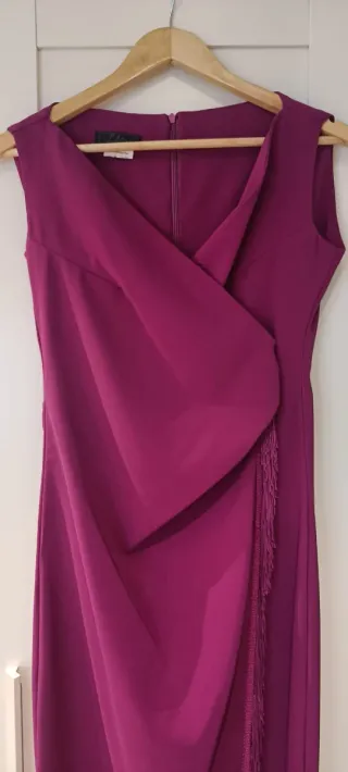Vestido juvenil de color fucsia oscuro, con un diseño drapeado y detalle de flecos en el lateral. - Diseño sin mangas. - Cierre de cremallera en la espalda. - Tejido con caída. - Largo midi Hago envíos por Correos Grado Asturias