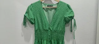 Vestido juvenil de Boohoo con estampado de lunares blancos sobre fondo verde. Presenta un escote en V y mangas cortas abullonadas con detalle de lazo. -Largo maxi. - Cintura elástica fruncida. - Cierre de botones en la parte delantera. Hago envíos por Correos Grado Asturias