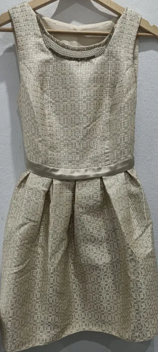 Vestido juvenil en color marfil, con un diseño elegante y moderno. Ideal para ocasiones especiales. -Largo mini - Tejido con textura. - Detalle de pedrería en el cuello. - Cinturón fino. - Falda con pliegues. Hago envíos por Correos Grado Asturias