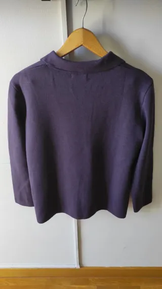 Chaqueta de punto para mujer en color morado. Presenta un diseño elegante con cuello camisero y cierre de botones. - Dos bolsillos delanteros. - Detalle bordado en la parte frontal. - Botones transparentes. Hago envios por Correos Grado Asturias