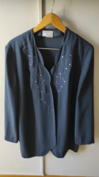 Elegante conjunto de tres piezas para señora en color azul marino. - Talla 50. - Diseño con detalles bordados en el escote. -Falda recta - Cremallera en la espalda.
