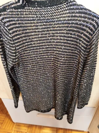 Elegante chaqueta de punto con un diseño a rayas y detalles brillantes. - Tejido con hilo metalizado y lentejuelas. - Diseño de rayas horizontales. - Cuello abierto y bolsillos frontales.