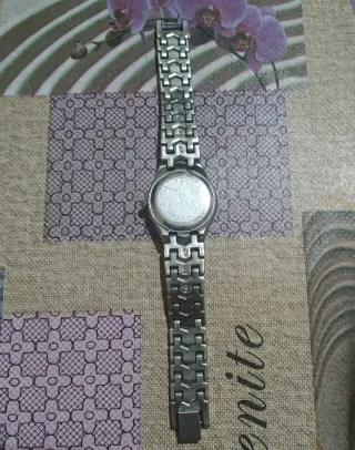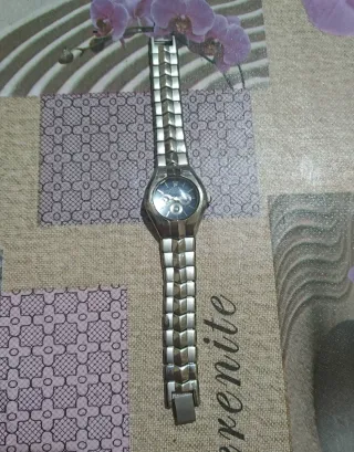 Reloj de mujer de acero usado con pila nueva puesta. Para muñeca pequeña. Medida total de la correa abierto 16 cm incluyendo la pieza de cierre 17 cm. En buen estado y funcionando. Se vende tal como se ve en las fotos.