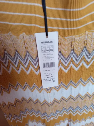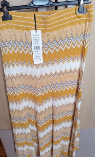 Falda larga de la marca MORGAN con un llamativo estampado de zig-zag. - Diseño de zig-zag en tonos amarillos, blancos y grises. - Tejido de punto. - Cintura elástica.
