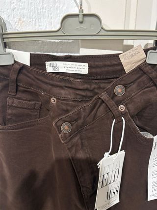 Pantalones de mujer de corte ancho y color marrón. Presentan un diseño cruzado en la cintura. - Diseño cruzado en la cintura. - Pierna ancha. - Bolsillos.