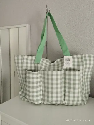 Bolso tote con un bonito estampado de cuadros. - Diseño de cuadros blancos y verdes. - Con múltiples bolsillos exteriores. - Asas cómodas para llevar al hombro.
