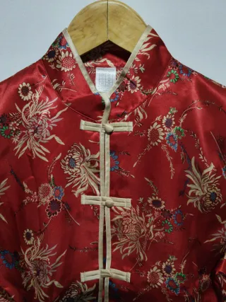 Conjunto de pijama de estilo oriental para mujer. Presenta un vibrante estampado floral sobre fondo rojo. - Tejido satinado con diseño floral. - Cierre de nudos tradicionales. - Ribeteado en contraste.