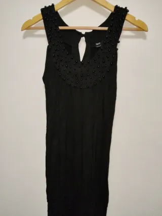 Vestido sin mangas con un diseño elegante y detalles de abalorios. - Cuello redondo adornado con pequeñas perlas. - Abertura en forma de lágrima en la parte delantera del cuello. - Diseño sin mangas. - Sirve para talla S y M