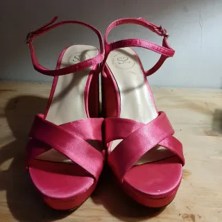 Elegantes sandalias de la marca Sfera. - Material satinado. - Diseño cruzado en la pala. - Tira al tobillo con hebilla. - Plataforma y tacón ancho.
