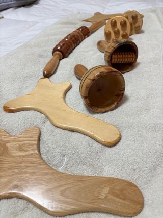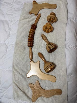 Conjunto de herramientas de madera de pino para maderoterapia. Este kit incluye 8 piezas diseñadas para diferentes aplicaciones. - Fabricado en madera. - Incluye rodillos y herramientas de masaje. - Ideal para uso profesional o personal.