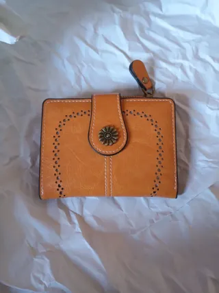 Elegante cartera de la marca Konedero en un llamativo color cuero. Su diseño presenta detalles perforados y un cierre de botón. - Diseño con detalles perforados. - Cierre de botón. - Acabado en piel