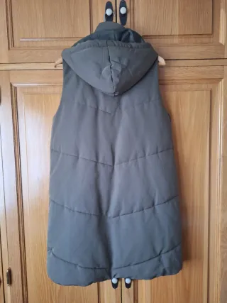 Chaleco largo acolchado de Sfera en un bonito tono verde caza. Es perfecto para añadir una capa extra de abrigo en días frescos. - Diseño acolchado con líneas diagonales. - Capucha integrada. - Cierre de botones a presión. - Bolsillos laterales con cremallera.