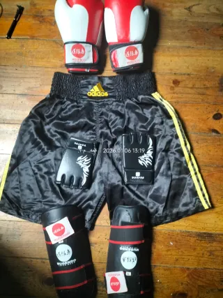 Pack de guantes de boxeo Top King y tobilleras de lucha Buddha. Bastante usados pero aun que parezca que no, funcionan bien. - Guantes blancos con detalles en marrón/dorado y negro. - Tobilleras rojas con logo negro.