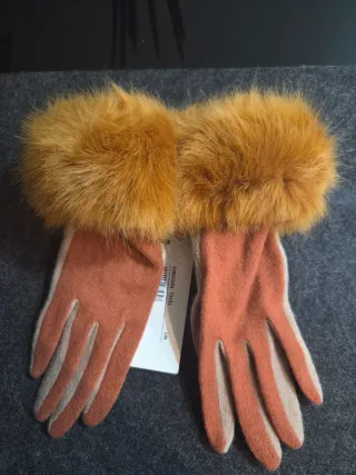 Elegantes guantes de lana con un detalle de pompón en la muñeca. - Diseño de dos tonos en naranja y beige. - Adorno de pelo sintético en la parte superior.