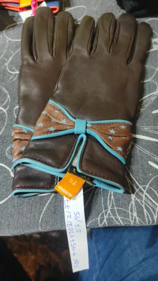 Elegantes guantes de cuero en tono marrón, adornados con un diseño de estrellas y un lazo. - Material: Cuero - Detalle de estrellas en contraste - Adorno de lazo con ribete azul - Talla 7 1/2