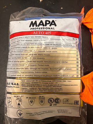 Guantes de trabajo MAPA PROFESSIONAL ALTO 405. - Fabricados en látex natural mezclado con neopreno. - Interior forrado de algodón. - Certificación EN ISO 374-5.