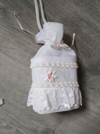 Limosnera con un diseño elegante y delicado, adornada con volantes de encaje. Ideal para complementar el tuendo e Comunión o Arras. - Incluye caja. - Nuevo a estrenar. Envíos en el mismo día! Más artículos de Comunión y Ceremonia en mi perfil. Consulta sin compromiso :) Si te lo llevas junto a otros artículos al mismo tiempo, te ajusto el precio. Junto a este artículo te puedes llevar: +5€ funda de traje/vestido en tela (fondo de las fotos) +5€ par de guantes (elije de mi perfil)