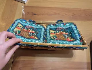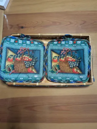 Set de dos manoplas de cocina. Cesta con diseño de manzanas y girasoles. Borde a cuadros. Incluye asa para colgar. Hago envíos a cualquier parte.