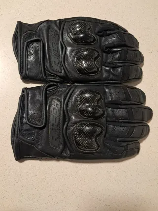 Guantes de moto RTECH en color negro. - Diseño con protecciones de carbono en los nudillos. - Material de cuero. - Cierre ajustable en la muñeca. -Talla L -Tienen 3 puestas -Los entrego limpios y desinfectados