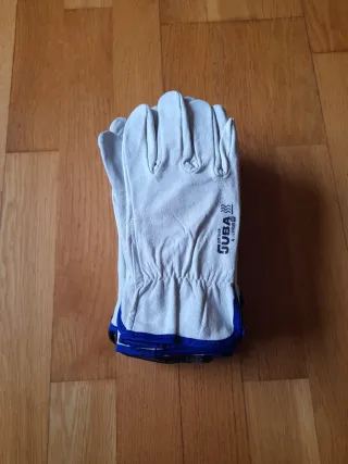 Conjunto de guantes de trabajo de alta calidad, sin usar. - Acabado de cuero resistente. - Borde de tela verde. - Talla T:9.