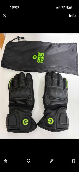 Guantes de moto de la marca Green Force. Diseñados para ofrecer comodidad y protección. - Material exterior de cuero. - Diseño acolchado en nudillos y palma. - Cierre ajustable en muñeca. - Logo de Green Force en color verde lima. Son calefactables si se usan con puños de la misma marca, sino son guantes normales