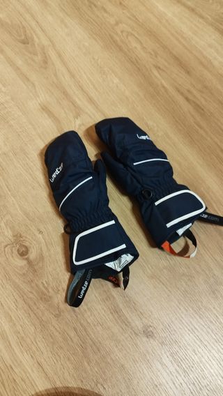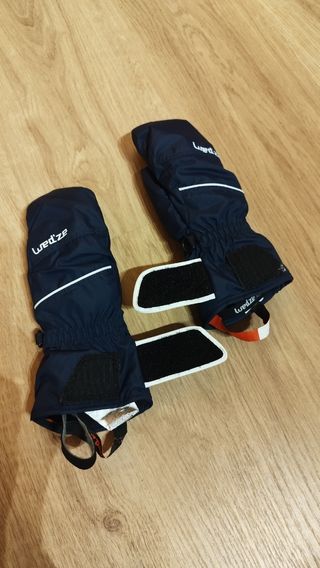 Manoplas de invierno para la nieve unisex de color azul oscuro, usadas un par de veces están como nuevas, con velcro en las muñecas, con gomas de seguridad para no perder y cintas para tirar e introducir la mano con comodidad. Talla para 8 años más o menos como indica la etiqueta.