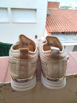 Preciosas zapatillas de mujer, talla 38. Ideales para un look casual y elegante. - Diseño con detalles dorados y piedrecitas - Suela de plataforma cómoda. - Material tejido fresco y elástico puestas parecen un guante - se pueden apretar o abrir con la evilla y la goma que tienen