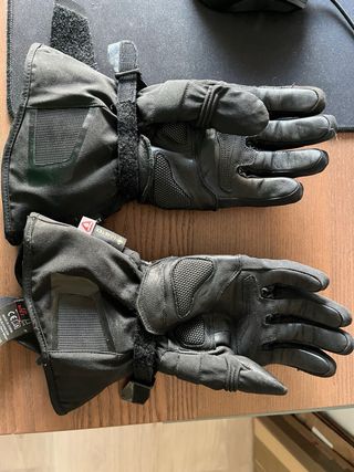 Guantes de moto Dainese en color negro. - Tecnología Gore-Tex. - Cremallera lateral para ajuste. Están en muy buen estado con poco uso pero llevan tiempo guardados y la parte trasera está la piel levantada pero no interfiere ni en la estética ni en la protección. Son guantes dobles ,por lo que aíslan bien del frío y la lluvia.