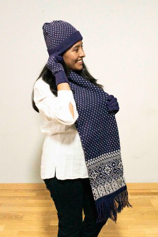 Conjunto de lana de alpaca que incluye gorro, guantes y bufanda. El diseño presenta un patrón de pequeños rombos en morado y blanco, con un borde decorativo en la bufanda. - Gorro de lana de alpaca. - Guantes a juego. - Bufanda con flecos (largo 180 cm x ancho 18 cm).