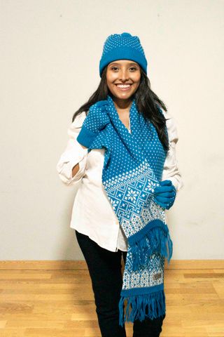 Conjunto de lana de 100% alpaca que incluye gorro, guantes y bufanda. El diseño presenta un patrón de pequeños rombos en turqueza y blanco, con un borde decorativo en la bufanda. - Gorro de lana de alpaca. - Guantes a juego. - Bufanda con flecos (largo 180 cm x ancho 18 cm).