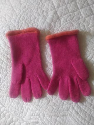 Guantes de lana color fresa ribeteados en color naranja. Son de lana. Es una talla M.