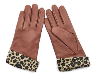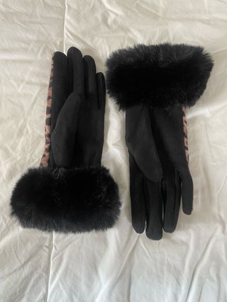 Elegantes guantes para mujer con un diseño animal print y detalle de pelo. - Talla única. - Acabado suave. - Borde de pelo sintético negro.