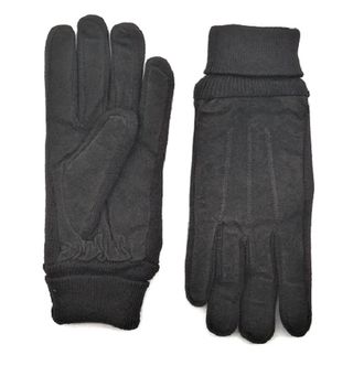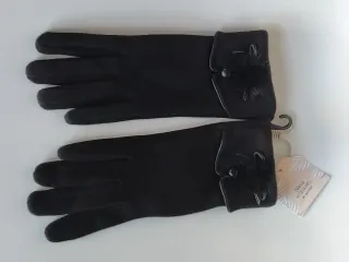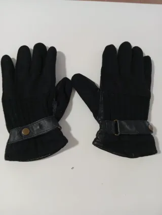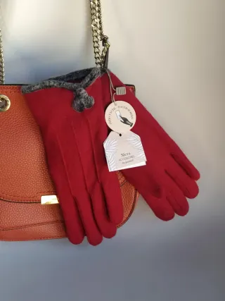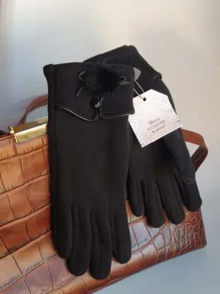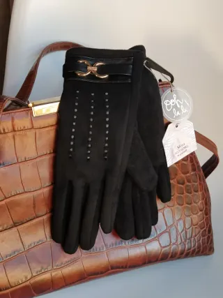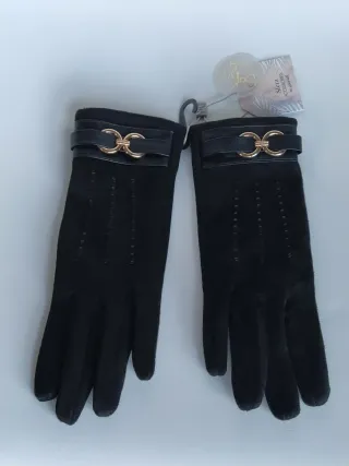 Guantes de mujer Sfera Accessories de El Corte Inglés. Material aterciopelado y de tacto muy suave estilo antelina. Talla única. Color negro mate. Con tres líneas de pespuntes decorativos en el dorso de la mano, aportando un toque clásico de sastrería. Cuentan con una banda de cuero sintético liso que incluye un herraje metálico dorado en forma de eslabones entrelazados. 🏷️ Nuevo con etiquetas. ✨ Estos guantes destacan por un estilo sofisticado y elegante, ideales para un look formal de invierno.
