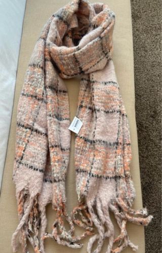 Conjunto de bufanda y guantes. La bufanda tiene el fondo de color violeta clarito que combina con los guantes. Composición: lana 30% y poliamida 70%. Medidas: 210 cm de largo y 52 cm de ancho. Los guantes son elásticos con 5% spandex y 95% poliéster. Sin estrenar, nevos con etiquetas.