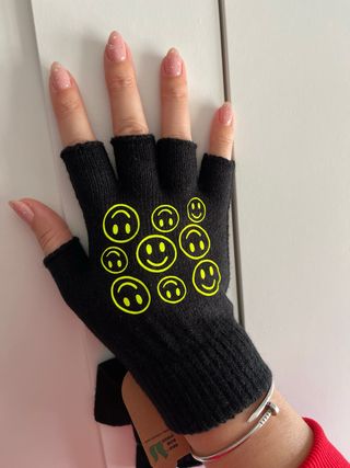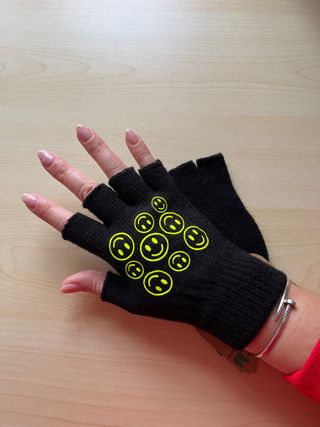 Guantes negro sin dedos con un divertido estampado de sonrisas. - Diseño sin dedos. - Estampado de smile en amarillo. Unisex para mujer y hombre DISPONIBLE SOLO OARA ENVIOS Envio en 24 horas