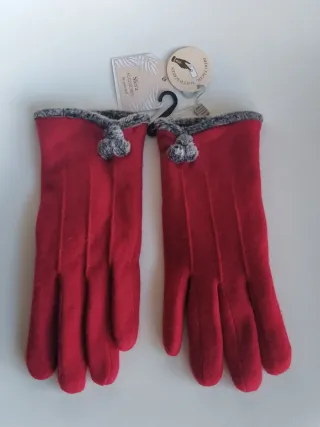 Bonitos guantes de mujer Sfera Accessories de El Corte Inglés. Con dedo táctil para usar teléfono móvil 📲. Material de punto cálido de lana con interior pelo polar muy suave. Talla única. Color rojo. Elegante acabado con tres pequeños pompones y ribete en pelo gris. 🏷️ Nuevo con etiquetas. ✨ Estos guantes destacan por un estilo sofisticado y elegante, ideales para un look de invierno.