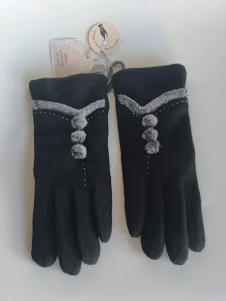 Guantes de mujer Sfera Accessories de El Corte Inglés. Con dedo táctil para usar teléfono móvil 📲. Material de punto cálido de lana con interior pelo polar muy suave color gris. Talla única. Color negro. Elegante acabado con pespuntes, tres pequeños pompones y ribete en pelo gris. 🏷️ Nuevo con etiquetas. ✨ Estos guantes destacan por un estilo sofisticado y elegante, ideales para un look de invierno.