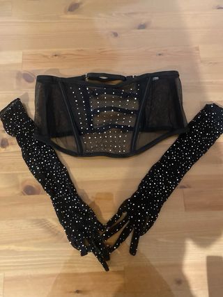 Conjunto de corsé y guantes largos. - Corsé de malla con detalles brillantes. - Guantes largos de malla con pedrería.
