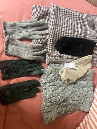 Conjunto de accesorios de invierno para mujer. - Guantes de lana grises. - Guantes de cuero verde oscuro. - Diadema negra de punto. - Bufanda cuello de punto gris. - bufanda cuello granate y blanca - diadema de punto beige.