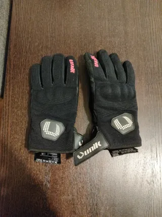 Guantes de moto de la marca Unik, talla L. - Diseño en color negro con detalles en rosa. - Cierre ajustable en la muñeca. - Protección en nudillos