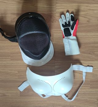 Conjunto de equipación de esgrima como nueva, usada solo un año: - Chaqueta talla 44. - Careta. - Guante de esgrima. - Peto protector de mujer talla M (ver imagen para medidas de pecho). Equipo como nuevo, se vende todo junto. No se rebaja.