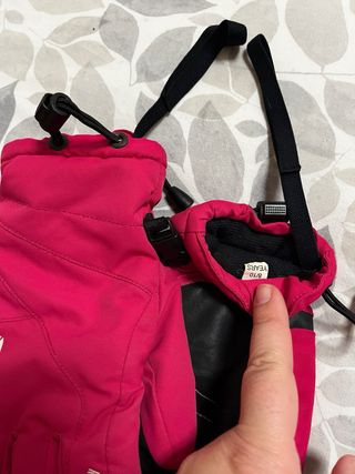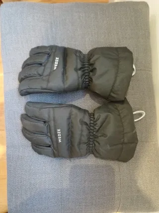 Guantes de esquí de la marca Wedze en color negro y gris. Diseñados para proteger del frío y la humedad. - Cierre de velcro en la muñeca. - Tiradores de ajuste en los puños. - Material exterior resistente. Nuestra hija los utilizó sólo por un año, ya este año le iban pequeños. Son del Decathlon, pero iban muy bien, ella no se quejó de frío y esquió toda la temporada.
