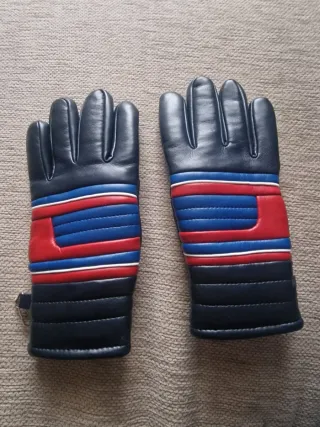Par de guantes de esquí en talla S, adecuados para mujer o niño. Presentan un diseño con detalles en azul y rojo. - Material exterior de cuero. - Acolchado en la zona de los dedos y el dorso. - Puño elástico para un mejor ajuste.