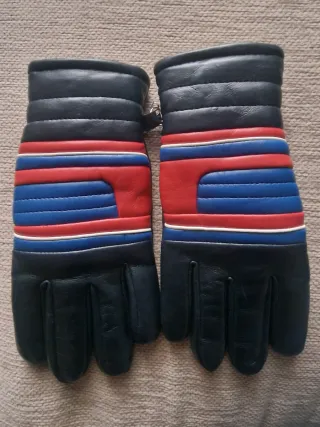 Par de guantes para niño o niña en talla M. Presentan un diseño con detalles en rojo y azul. - Material: Piel. - Cierre ajustable en la muñeca.