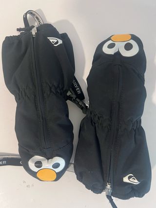 Manoplas de Quiksilver con un divertido diseño de pingüino. Solo un uso . - Cierre de cremallera frontal. - Detalle de ojos y pico de pingüino. - Puño elástico. - Correa de sujeción.