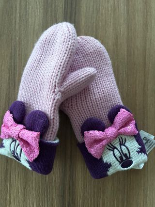 Adorable par de manoplas de punto para niña con el personaje de Minnie Mouse. - Diseño de Minnie Mouse con orejas y lazo de lentejuelas. - Puño de punto morado. - Tejido principal de punto rosa. - Forro polar Talla XS/S